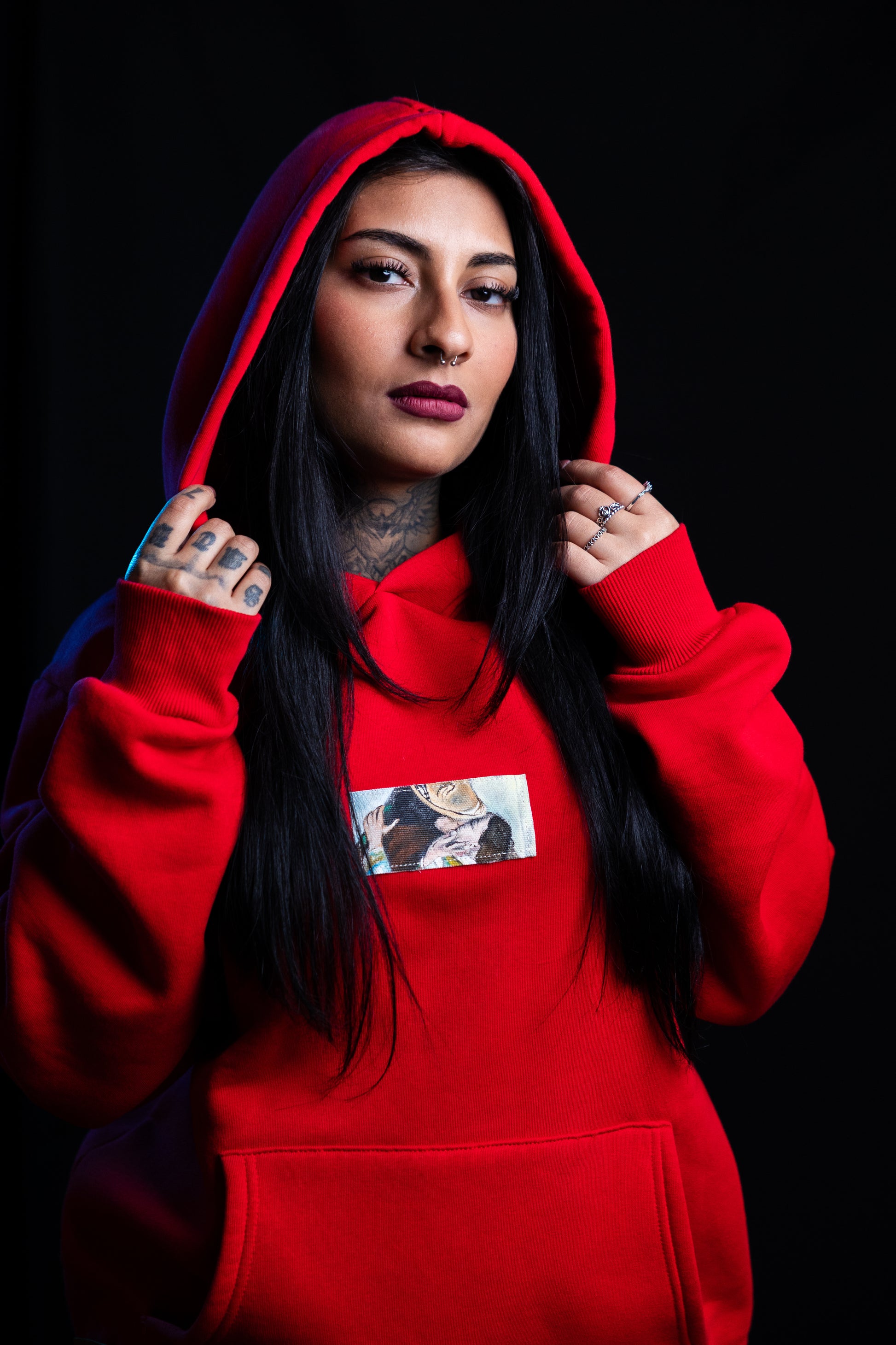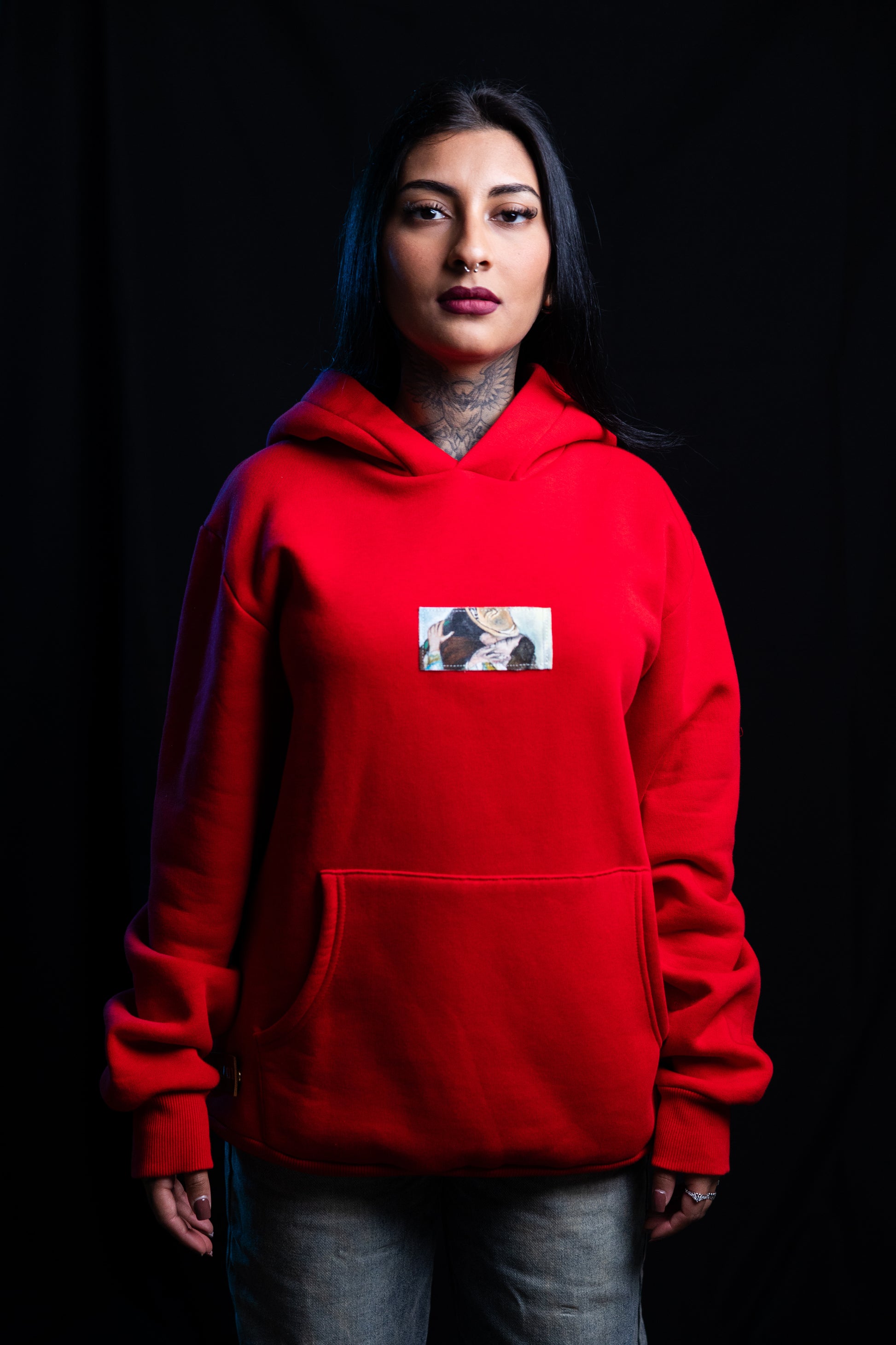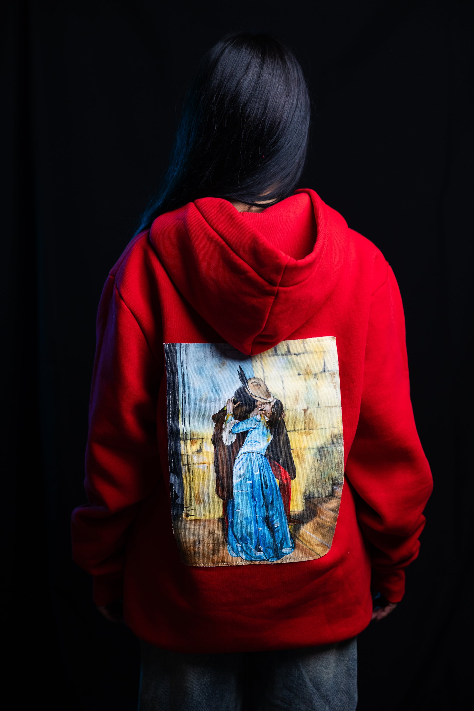 Il tessuto morbido e resistente avvolge il corpo con eleganza, mentre il cappuccio dona un tocco urbano e contemporaneo. In questa versione, il rosso intenso della felpa fa da cornice perfetta a un doppio intervento artistico unico: due inserti in cotone su cui è stata dipinta a mano un'opera ispirata a “Il Bacio” di Hayez , simbolo eterno di passione, libertà e unione.