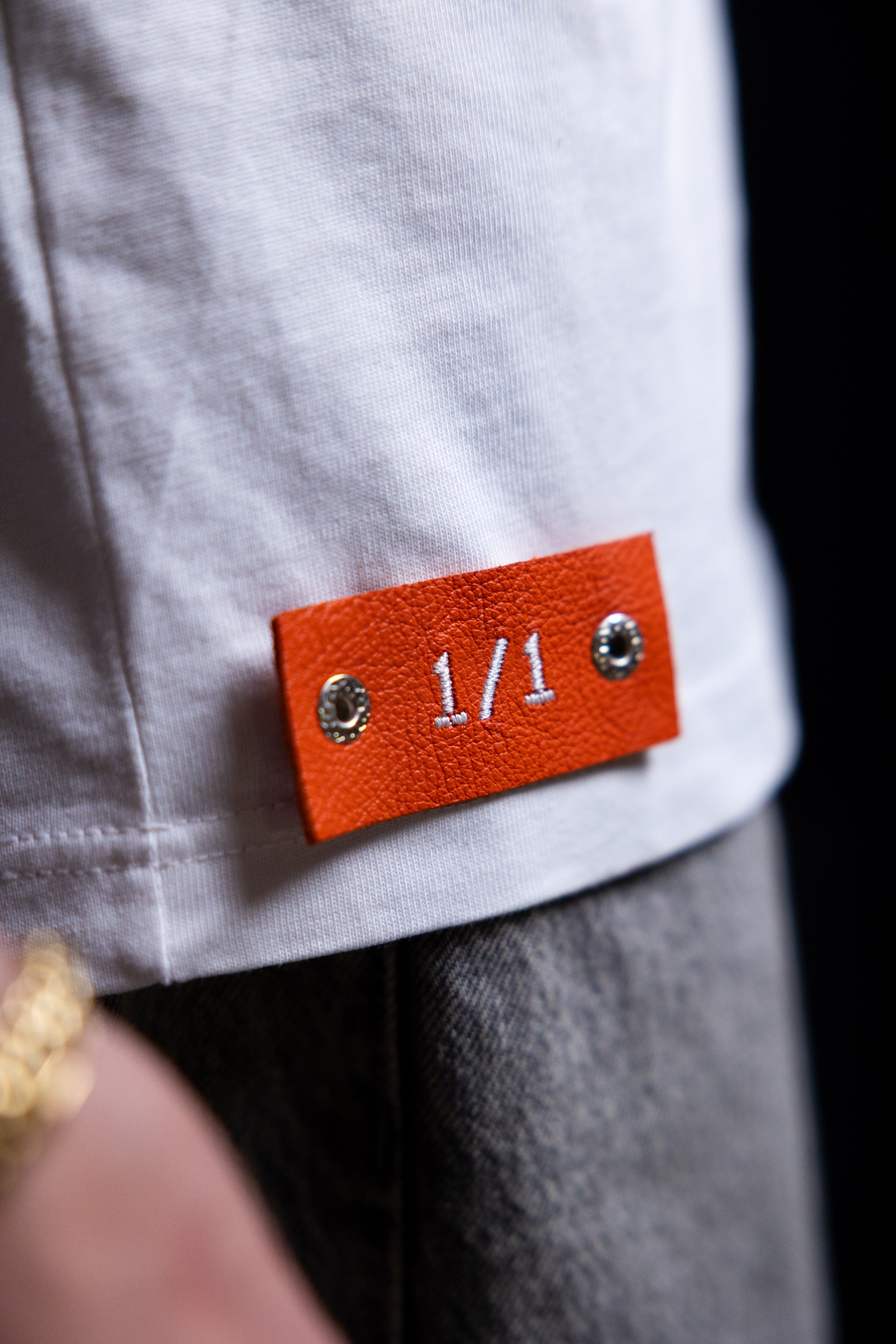 Prodotta in un solo esemplare al mondo, questa t-shirt è contrassegnata da un’etichetta numerica arancione rimovibile, con la dicitura 1/1, a testimonianza della sua unicità.